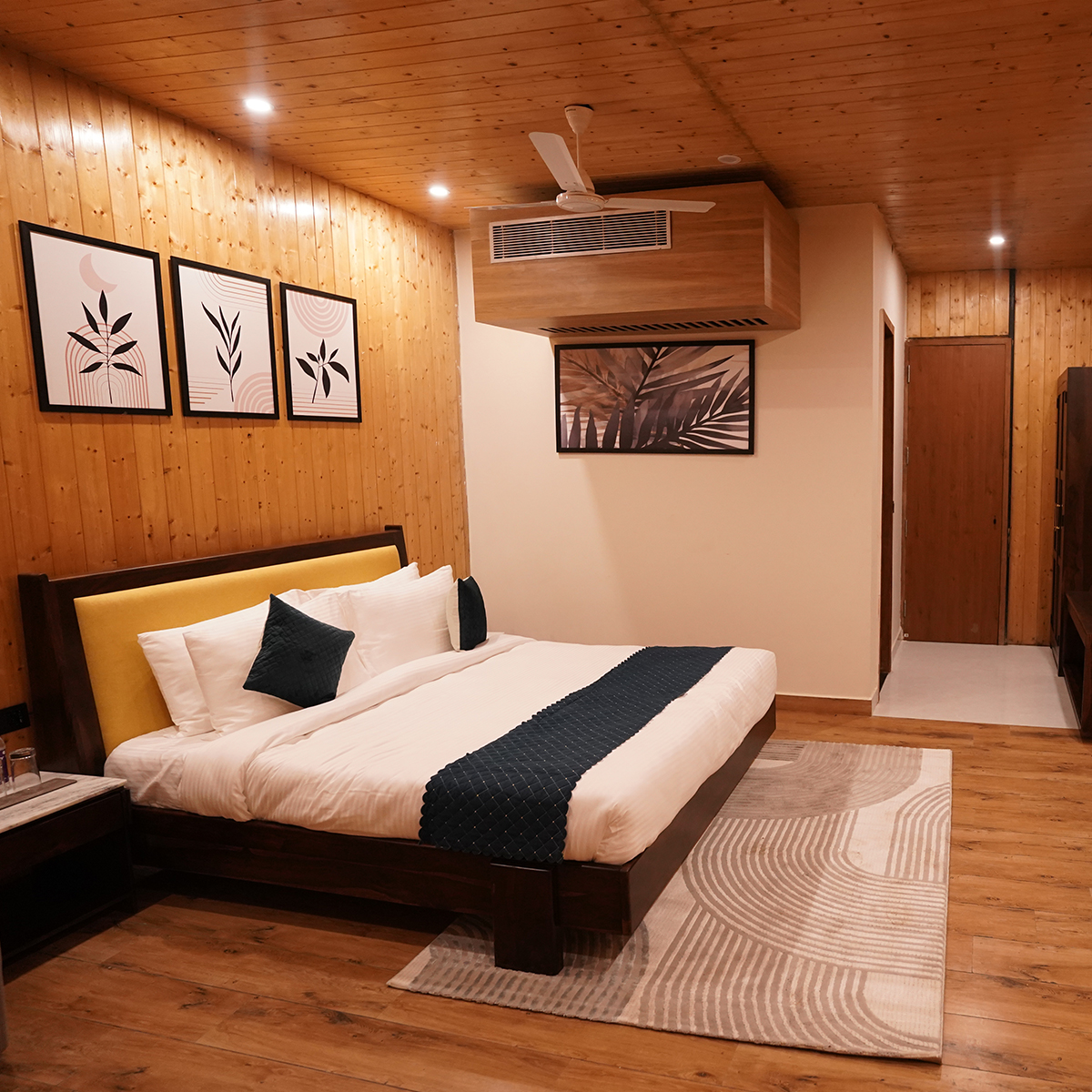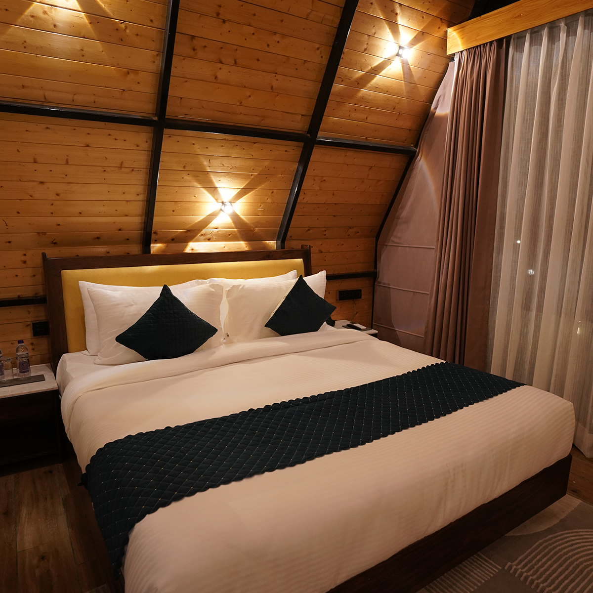 Crafted entirely from pine wood, the Safeda Room offers a warm and inviting atmosphere across 650 sq. ft. of space. With its natural textures, soothing aroma of wood, and spacious layout, it' s perfect for guests who appreciate rustic charm blended with modern comfort. A serene stay surrounded by nature awaits you here.