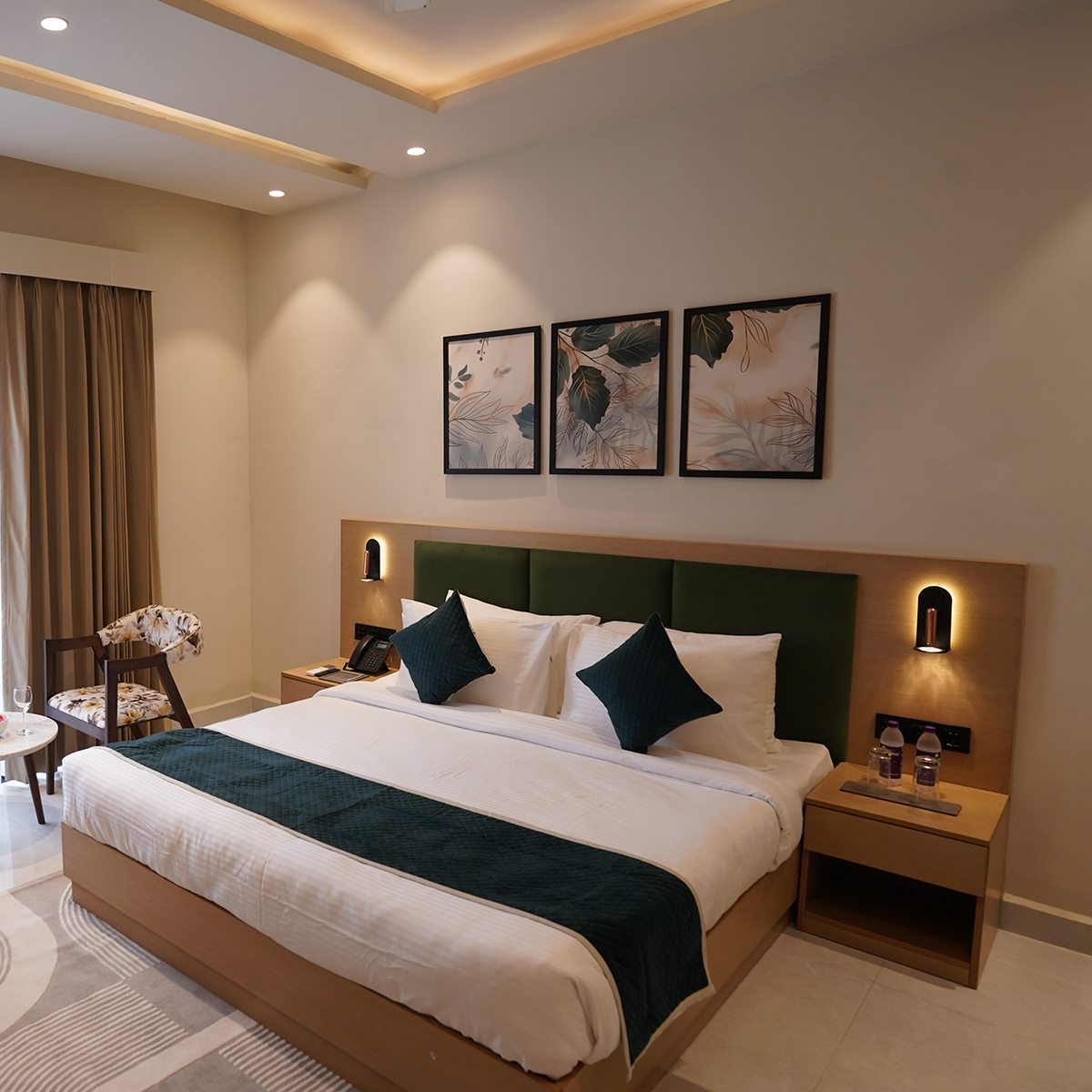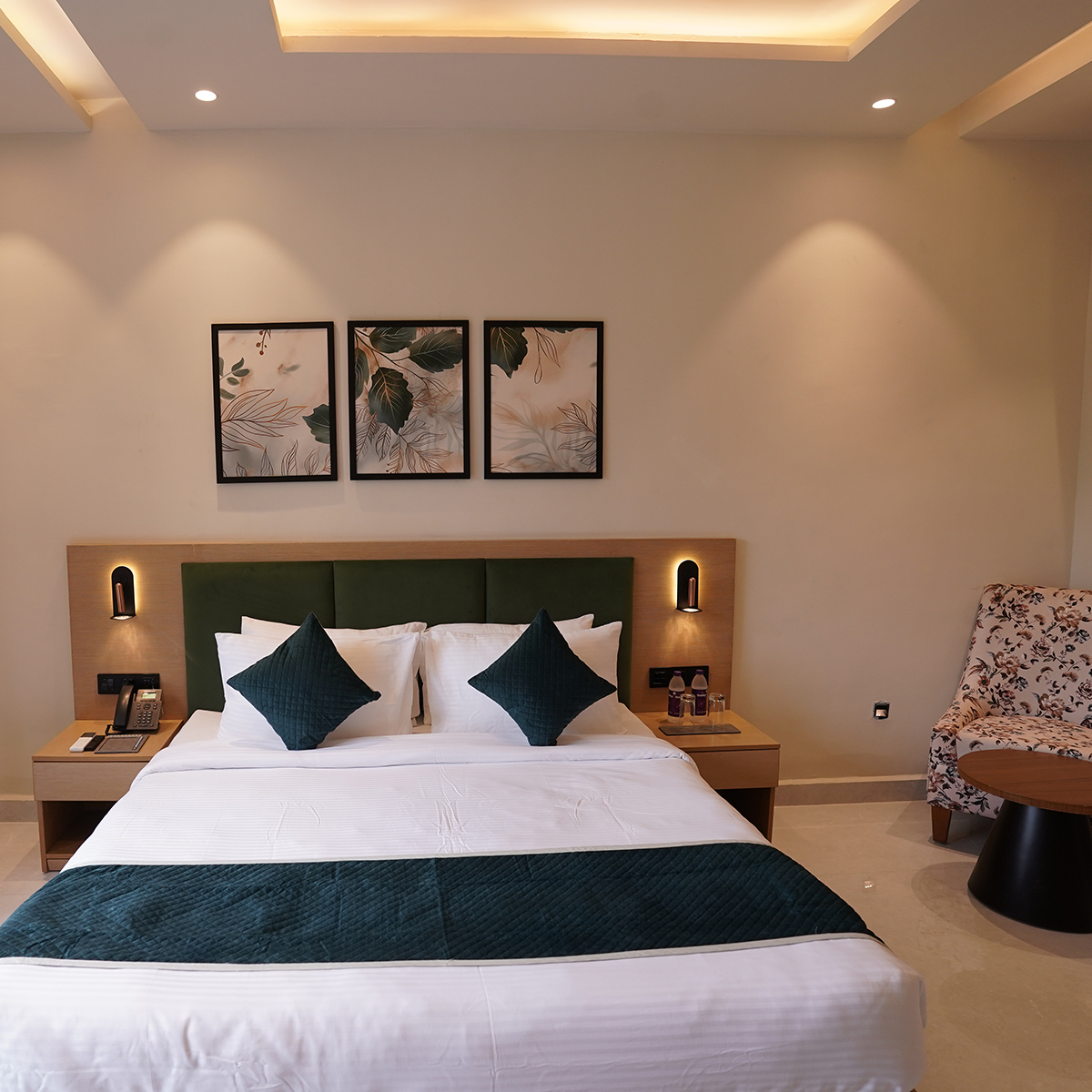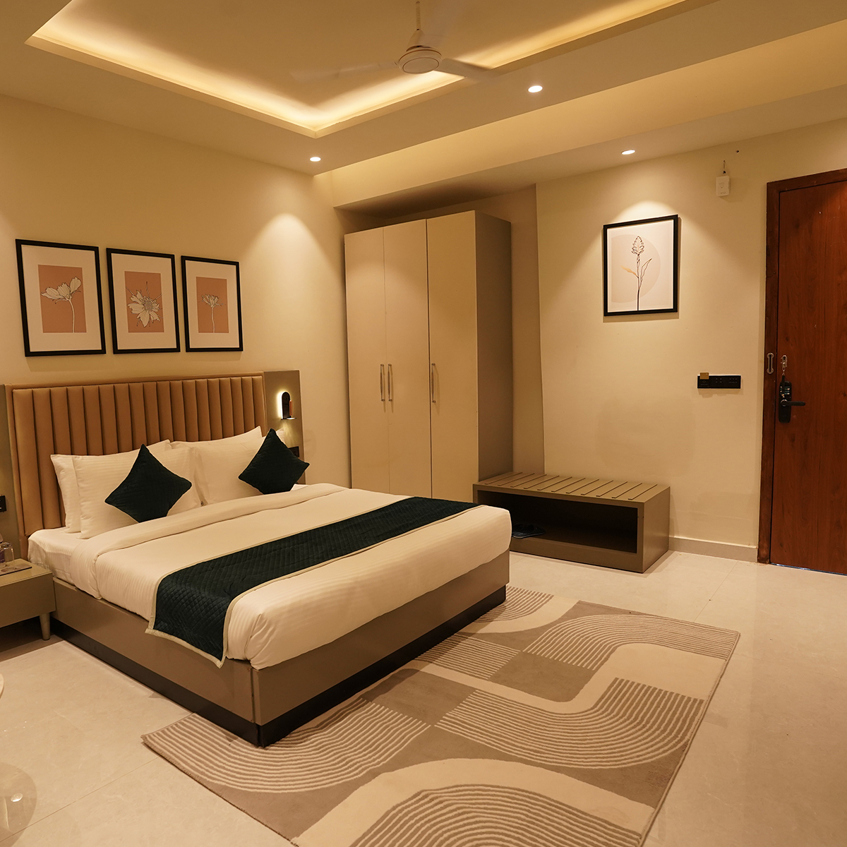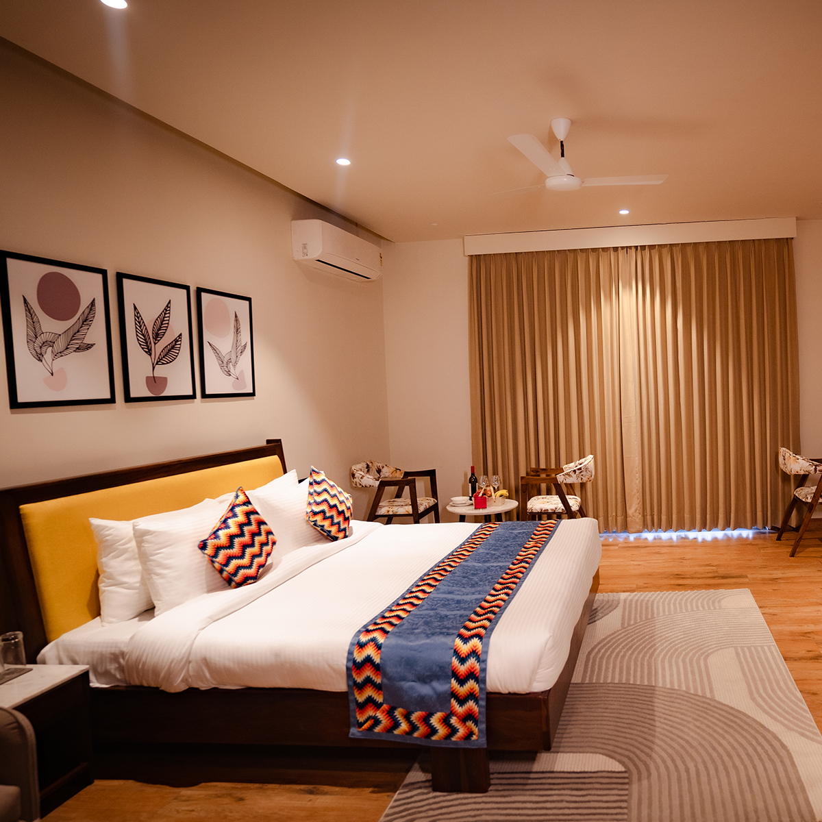 Step into the elegance of our Kesar Room, offering 425 sq. ft. of spacious comfort. With stylish décor and modern amenities, it's designed for both relaxation and productivity. Perfect for longer stays or guests who enjoy a little extra space, the room provides a serene and inviting ambiance.